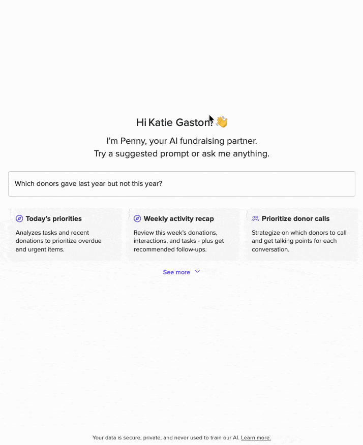 Ask Penny a simple question like, “Which donors gave last year but not this year?” Instead of building a report manually, Penny instantly analyzes your donor data and surfaces supporters who may be ready to reconnect.