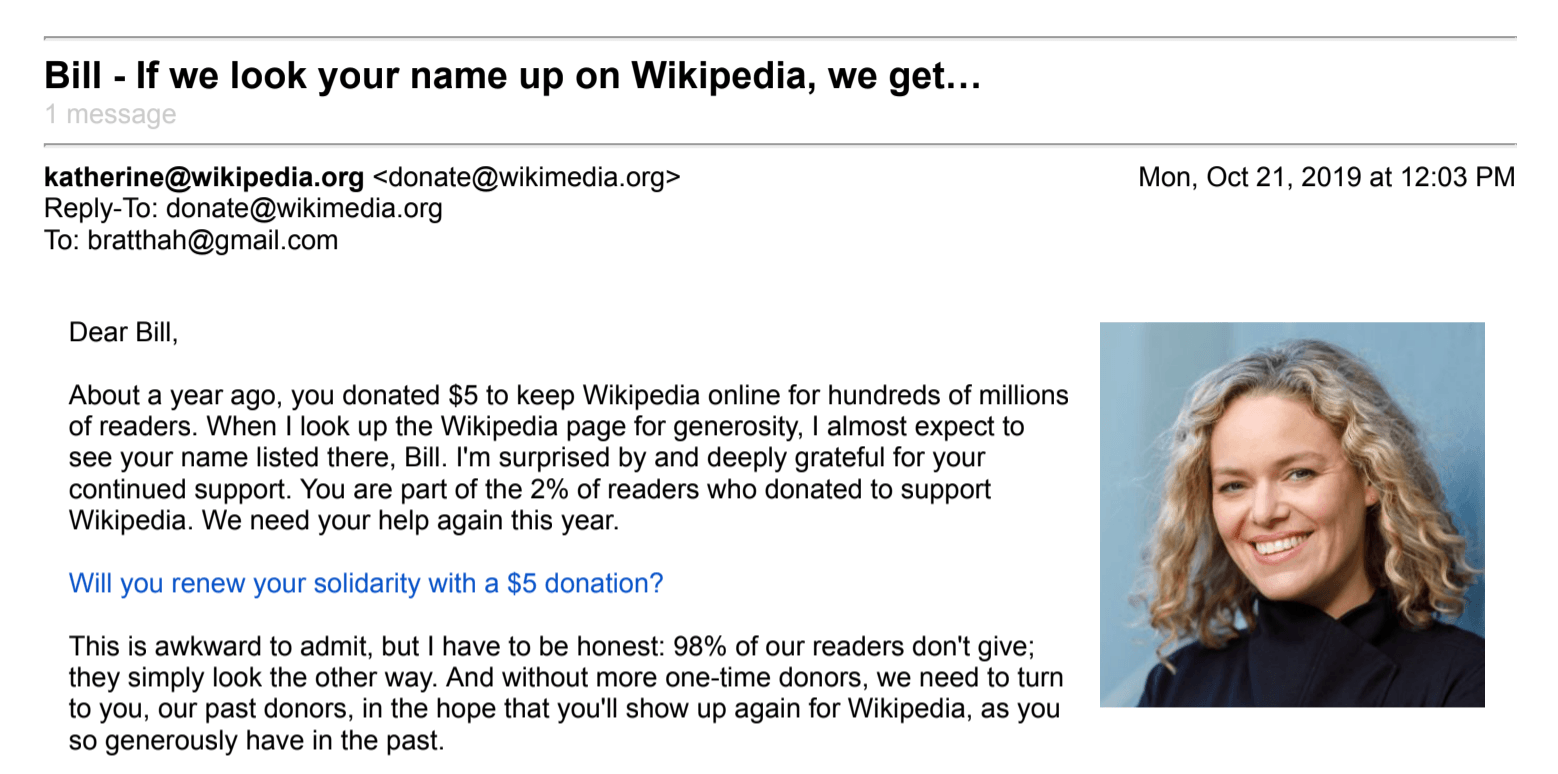 Use a real email address. While the email is signed by the ED’s Director, Katherine Maher, the email itself was sent from donate@wikimedia.org. Nothing could be more impersonal and non-relational! Use a real email address when communicating with your donors and destroy all role-based email address such as info@nonprofit.org, development@nonprofit.org, noreply@nonprofit.org, etc. to keep things personal and relational!